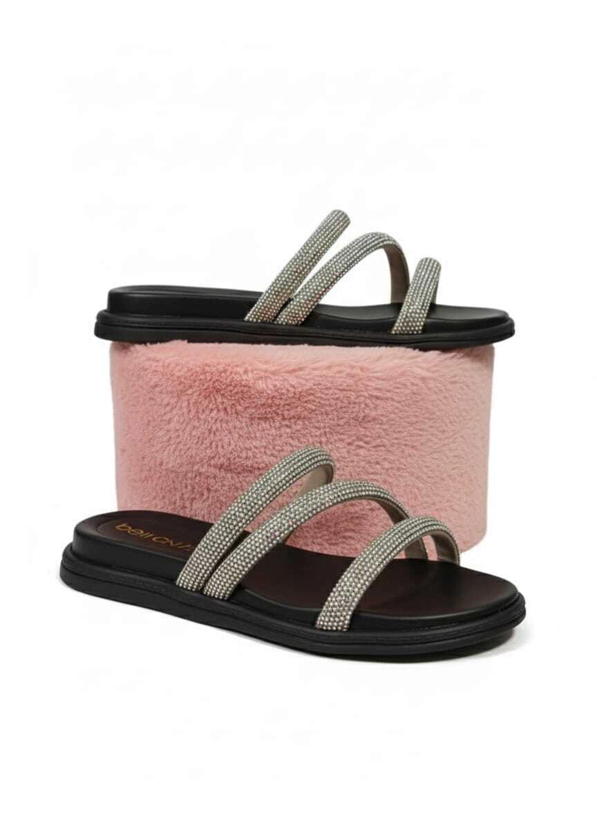 Brilhe por onde for com o conforto que você merece! ✨ Apresentamos a papete perfeita para adicionar um toque de glamour aos seus looks. Com tiras repletas de strass e uma sola super confortável, você estará pronta para qualquer ocasião, do dia à noite, com muito estilo e sem abrir mão da leveza. Seus pés merecem esse luxo!
